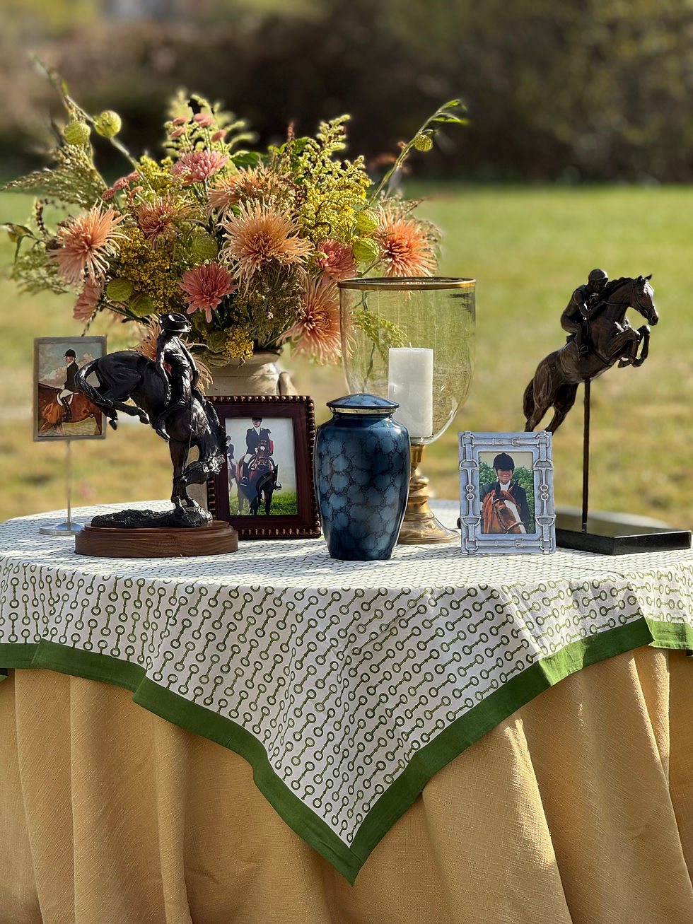 “Honoring the people in one’s life that made life better”—In late October, I had the honor of working on an outdoor memorial for a beloved member of the Millbrook community, Bonnie Stedt. My client as well as the host of this day, shared the depth of their friendship and gave me insight to why this day was so important to her and to those that shared in Bonnie’s professional, recreational and countrified life. This event was striking in how grounding it felt to reflect on a life well lived and a career that soared. Honoring her equestrian lifestyle, we leverage on the warmth and beauty of the season and her farm.
